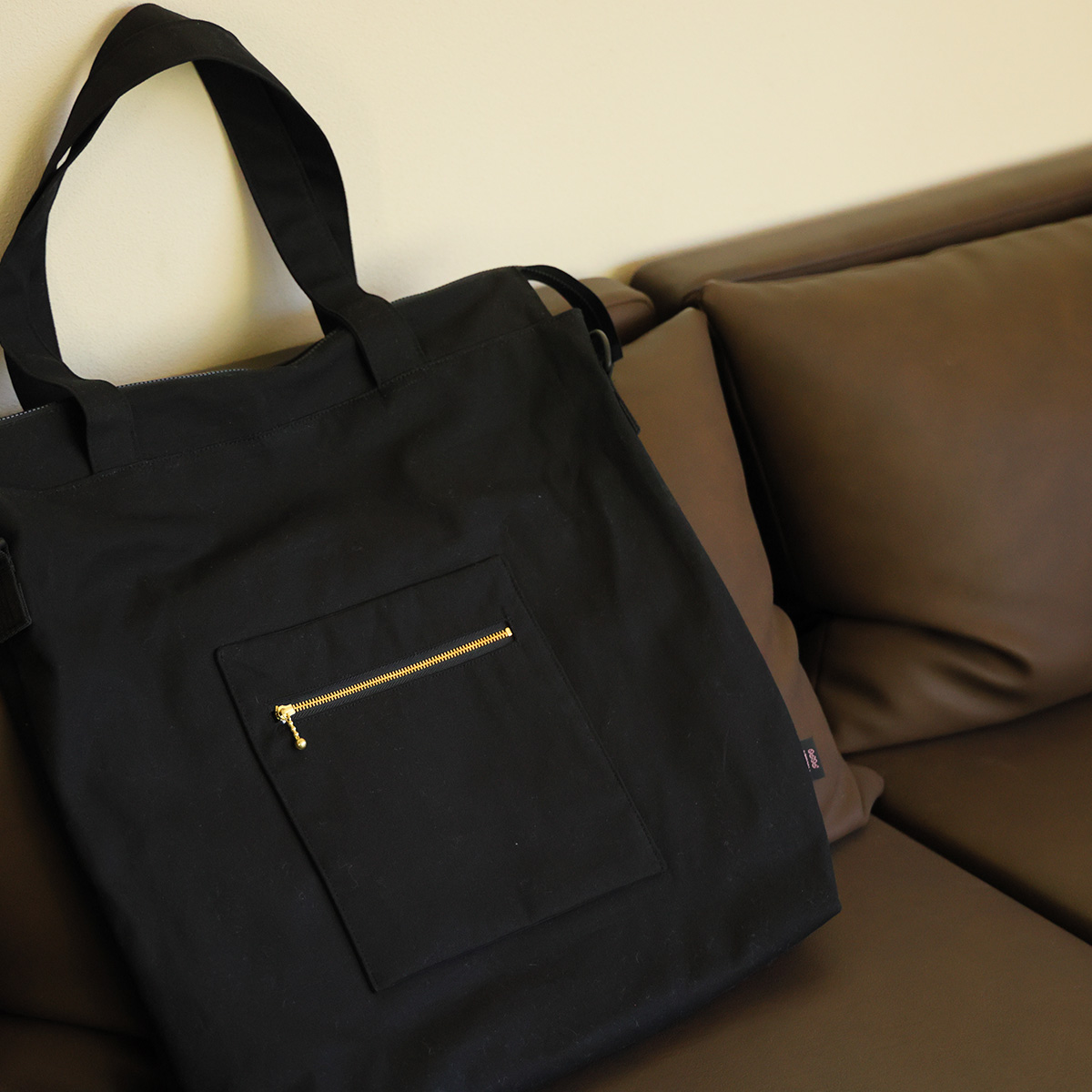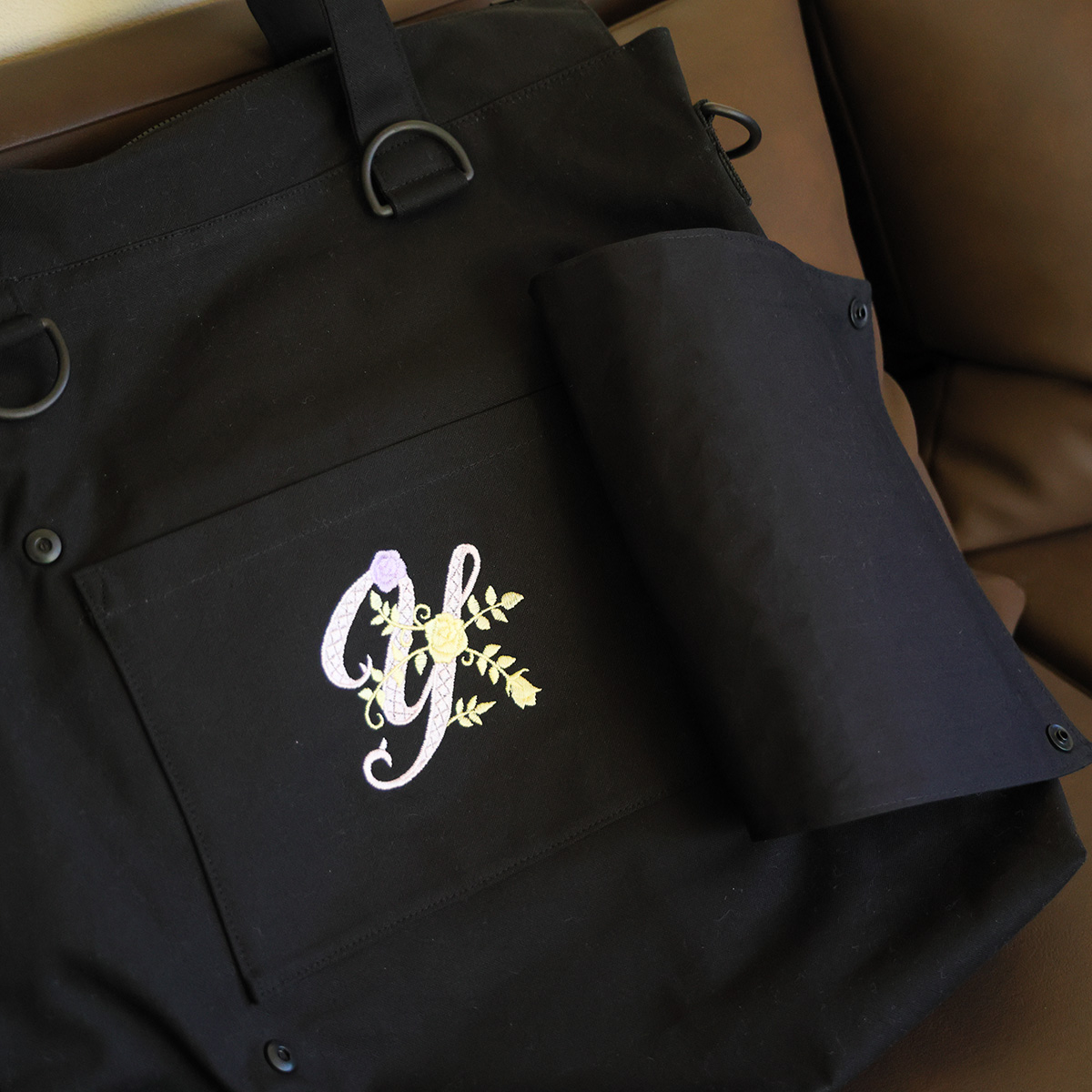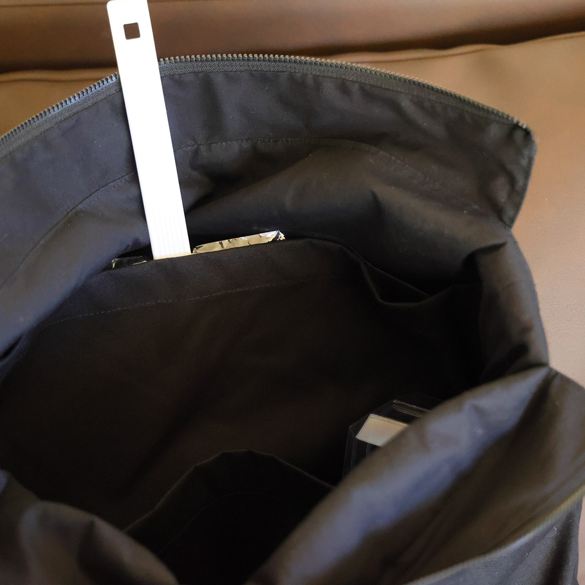 裏側はポケットだけのように見えて、キャリーの持ち手部分に挟めるようになっています