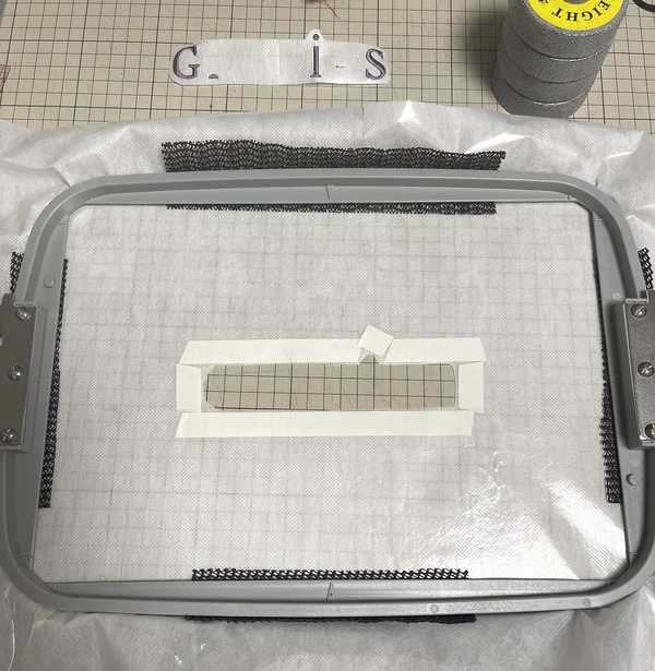 置き縫いのシートに刺繍位置の穴をあけて周りは両面テープを貼っています